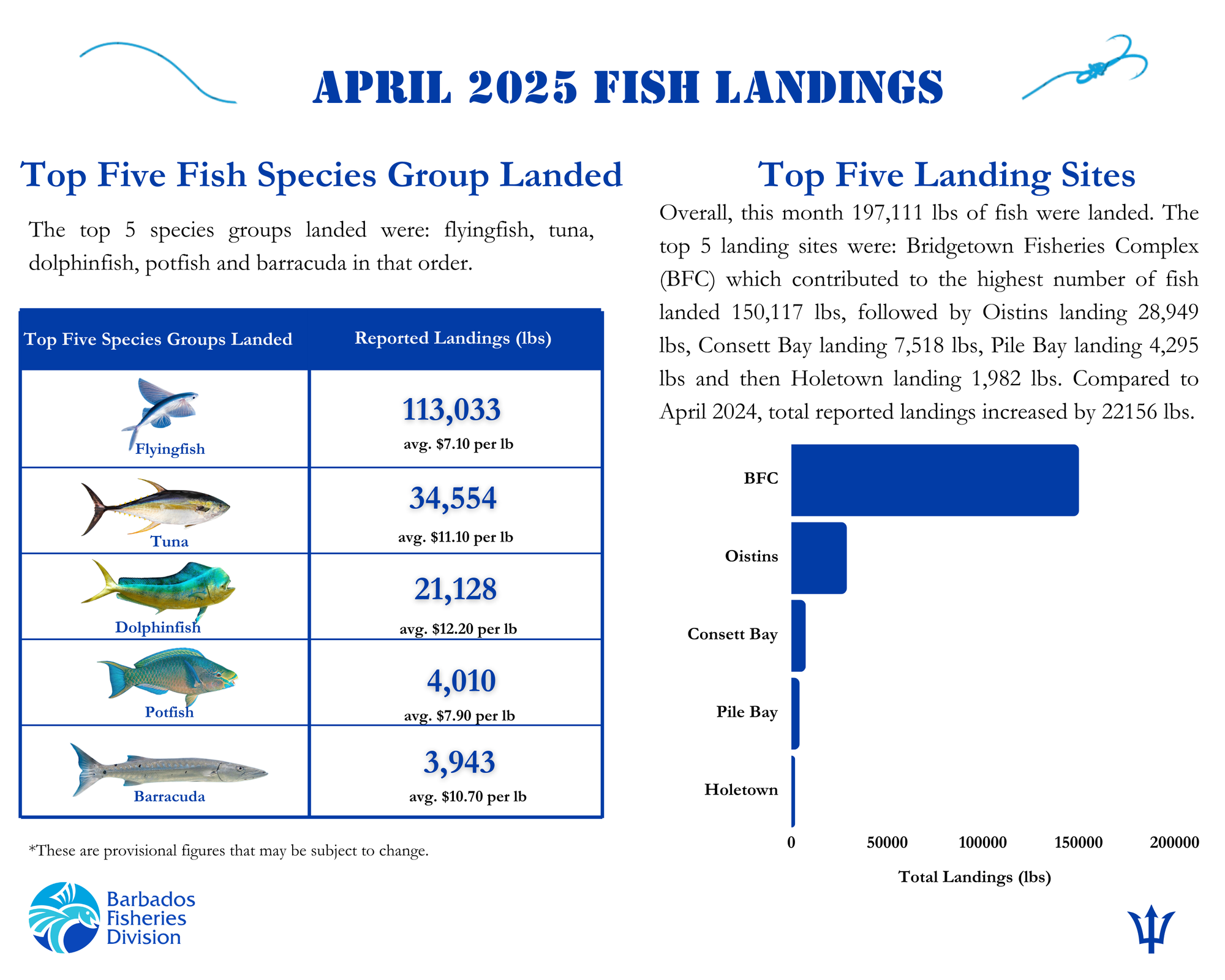 Overall, this month 197,111 lbs of fish were landed. The top 5 landing sites were: Bridgetown Fisheries Complex (BFC) which contributed to the highest number of fish landed 150,117 lbs, followed by Oistins landing 28,949 lbs, Consett Bay landing 7,518 lbs, Pile Bay landing 4,295 lbs and then Holetown landing 1,982 lbs. Compared to April 2024, total reported landings increased by 22,156 lbs.