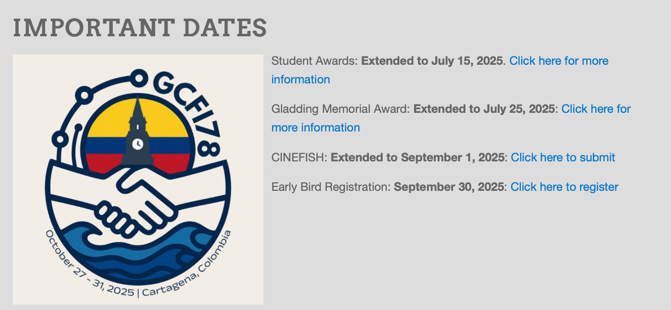The Gulf and Caribbean Fisheries Institute is set to host its 78th conference in Cartagena, Colombia, from the 27th-31st of October, 2025. The conference serves as a knowledge exchange between fisheries scientists, managers, and other stakeholders throughout the Caribbean and the Gulf of Mexico, sharing challenges and collaborating on solutions for marine ecosystems, fisheries, climate change, and marine litter.