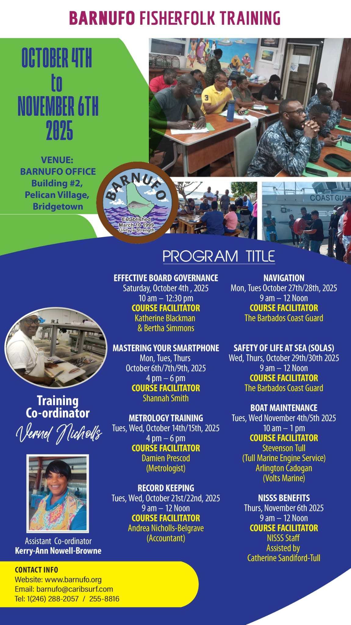 In alignment with the Barbados National Union of Fisherfolk Organisation's (BARNUFO) mandate to strengthen the fisheries sector through training, capacity building, and sustainability initiatives, we are pleased to inform that the organisation is delivering Fisherfolk Training, scheduled to take place from October 4th to November 6th, 2025.