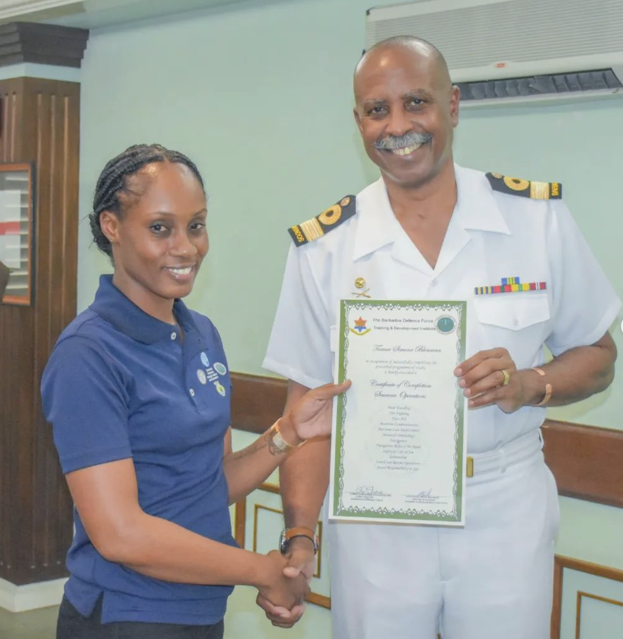 The ceremony was held under the patronage of the Honourable Adrian Forde, Minister of the Environment, National Beautification, Green and Blue Economy. Chief of Staff Barbados Defence Force, Commodore Errington Shurland and Military Advisor to the Chief of Staff Lieutenant Colonel Carlos Lovell and Ms Yolande Howard, Permanent Secretary, Ministry of the Environment, National Beautification, Green and Blue Economy presented certificates to the successful participants.