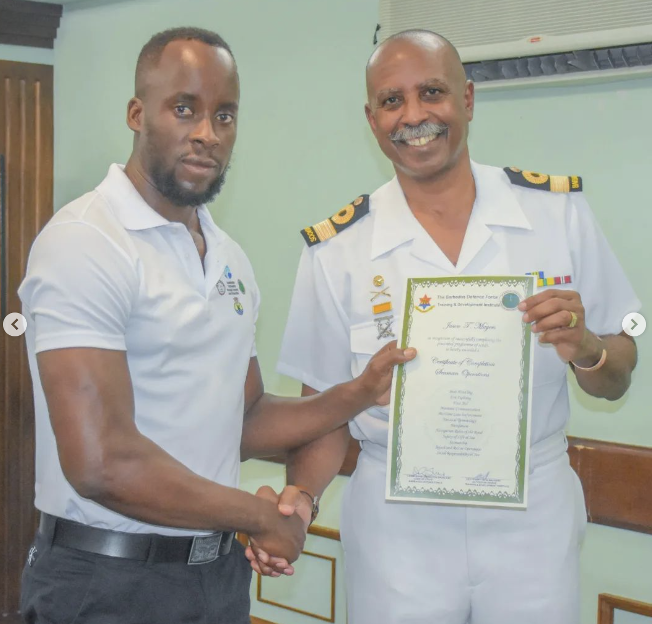 The graduation ceremony for the Vessel Seamanship Operations (Basic and Advanced) Level 2 NVQ and Fishing Vessel Operations Level 3 NVQ course was held at BCGS PELICAN on Friday 26 January 2024. The course was offered in partnership with Barbados National Union of Fisherfolk Organizations (BARNUFO), the Barbados Fisheries Division and the Barbados Defence Force Training and Development Institute (BDF TDI), the Barbados Coast Guard and the TVET Council Barbados.