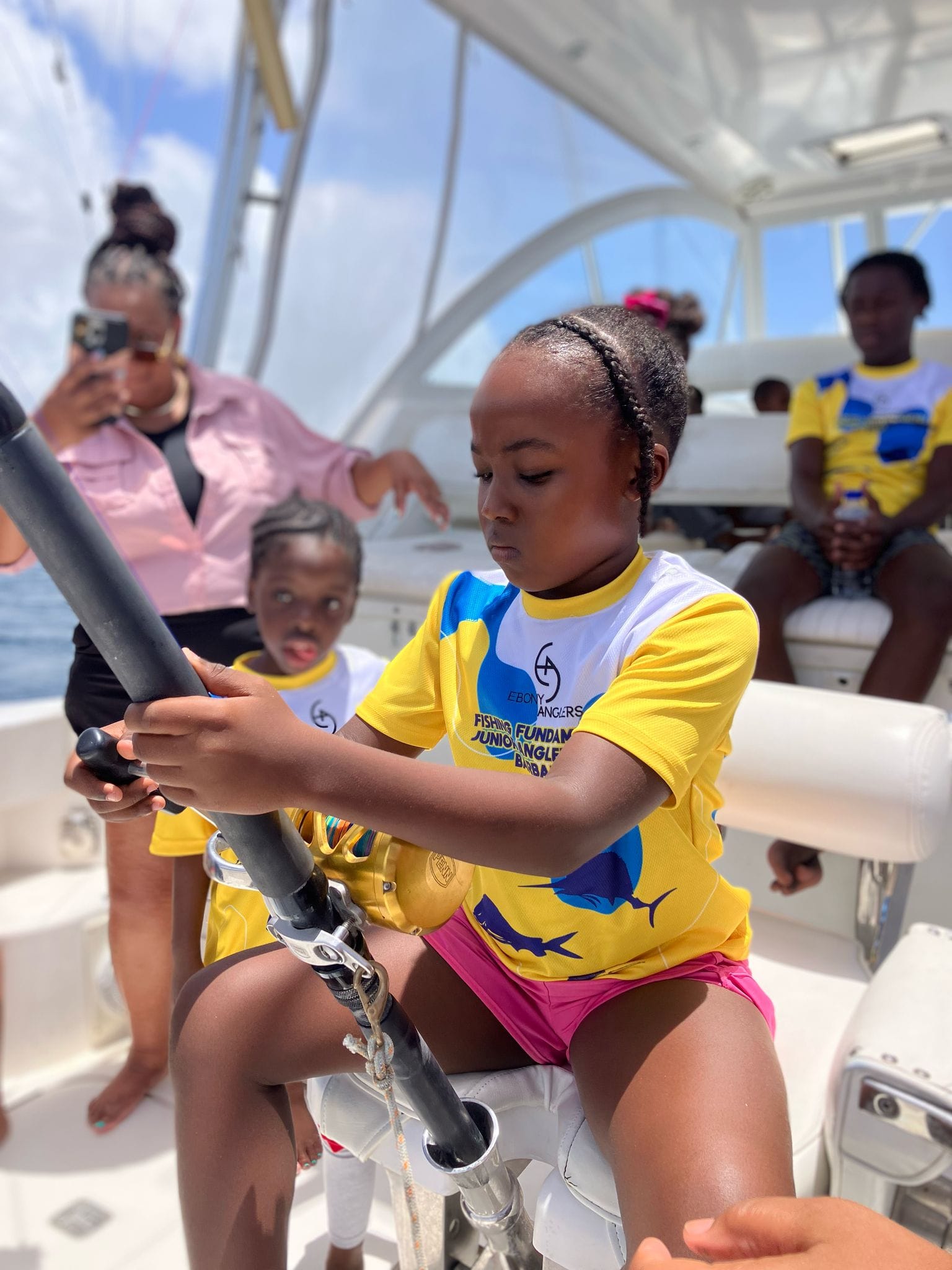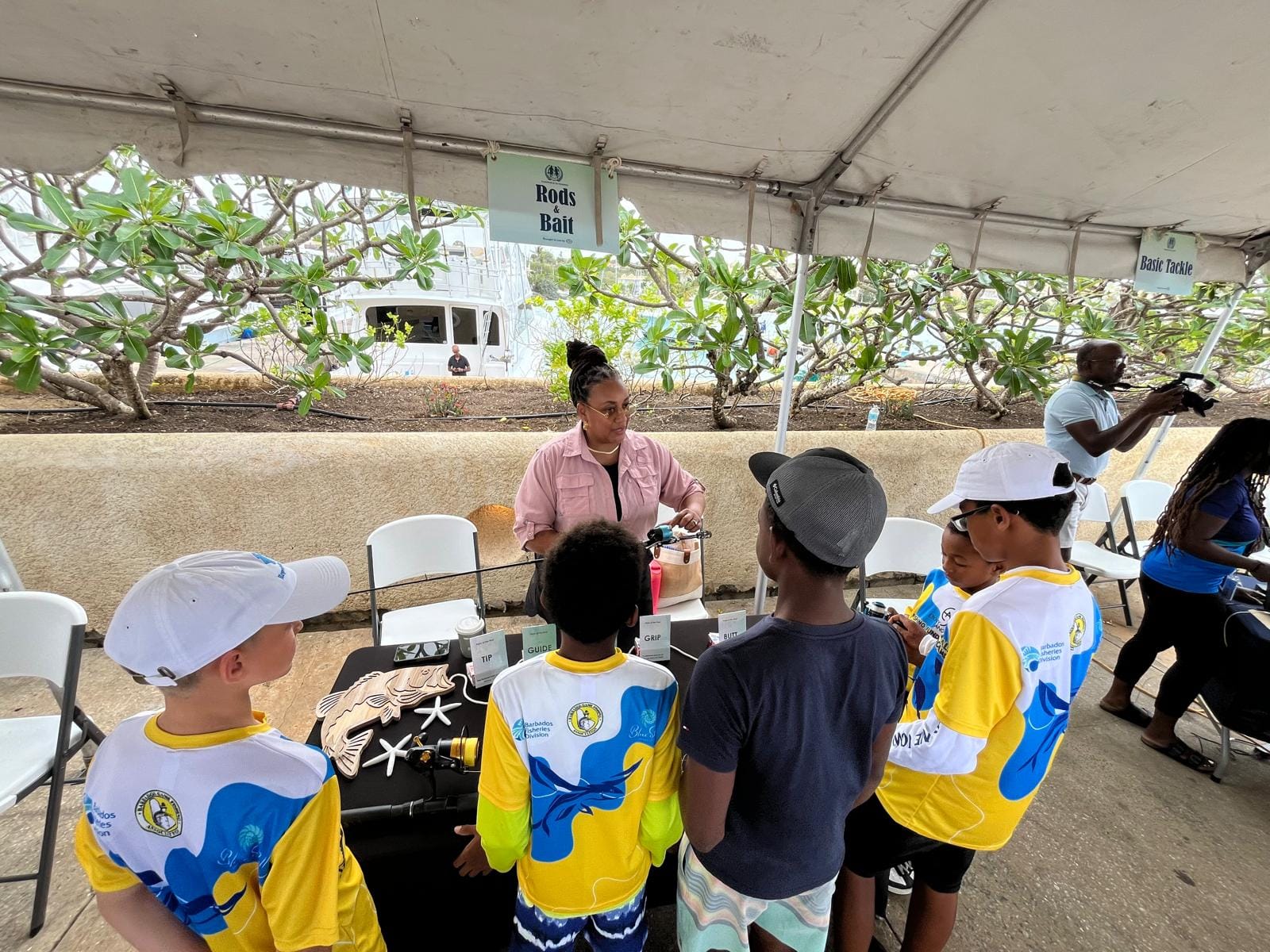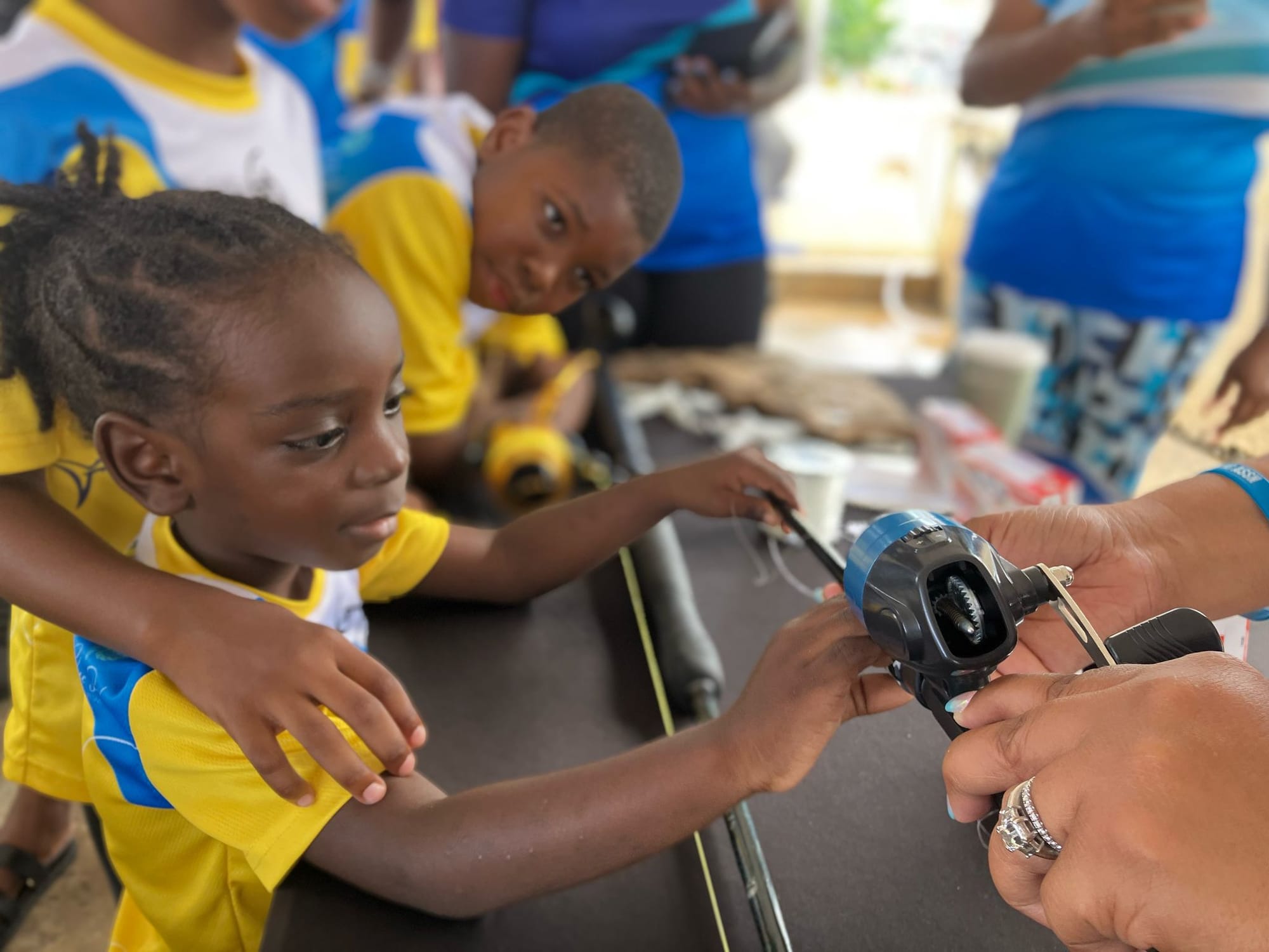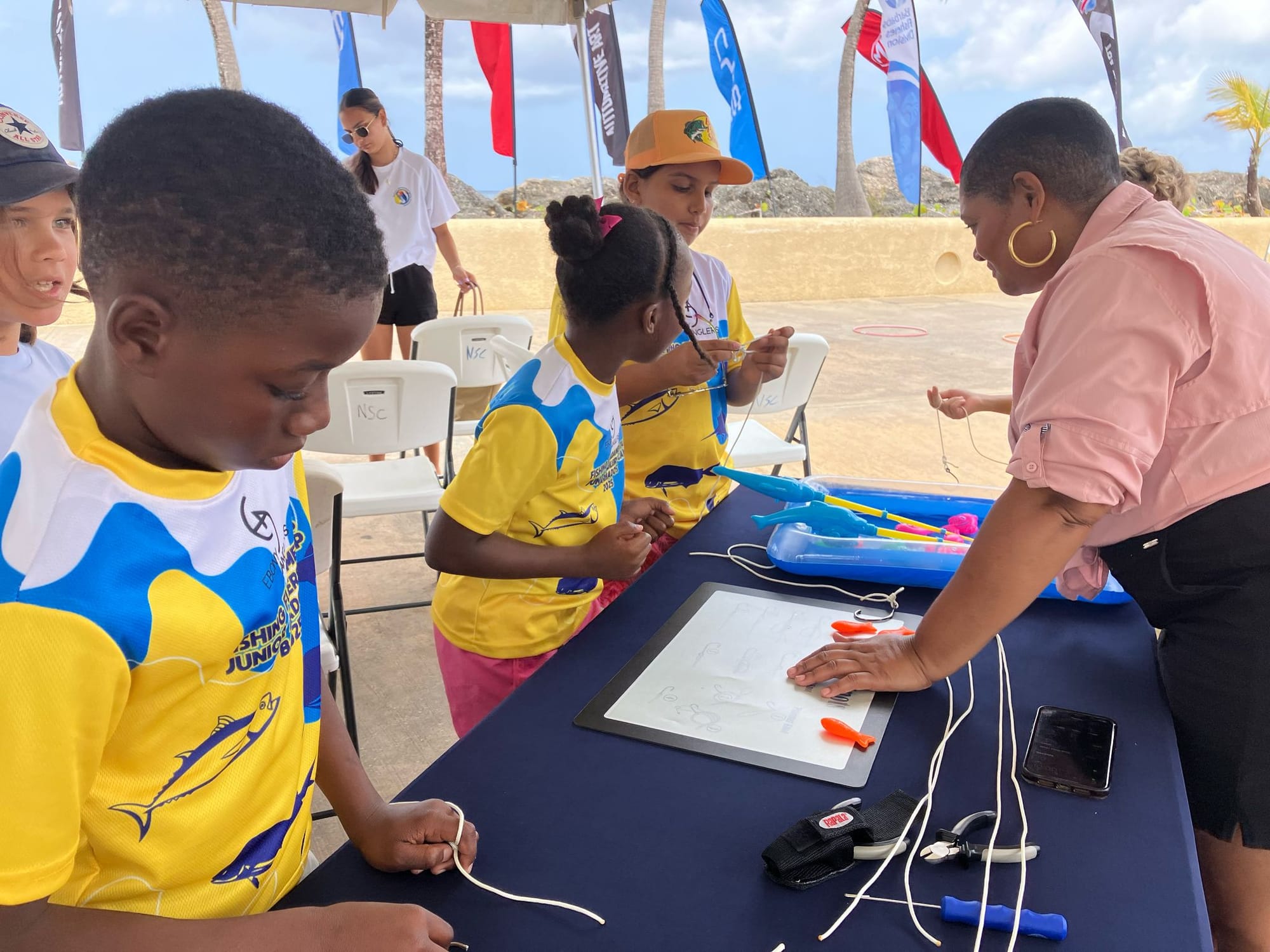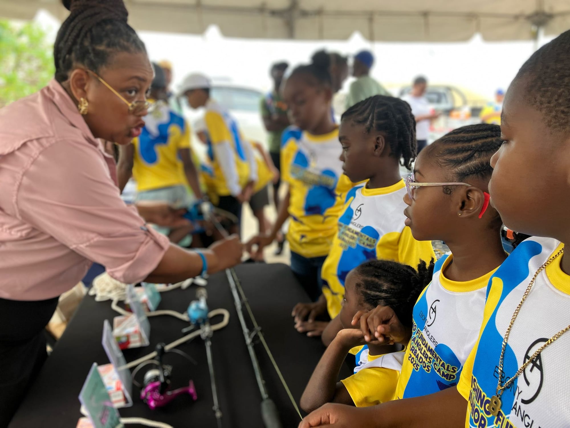 During the lay-day (11 April 2025) of the 2025 Republic Bank Sir Charles Williams International Tournament, the Ebony Anglers hosted four stations, each teaching the children different fundamentals in fishing. The Ebony Anglers' Lesleigh Mausi spoke to eager ears about rods and bait, Glenda Turner taught about the basics of tackling, Gia Peebles walked them through safety and casting of gear, and Tiana Davis demonstrated the different types of knots that can be tied.