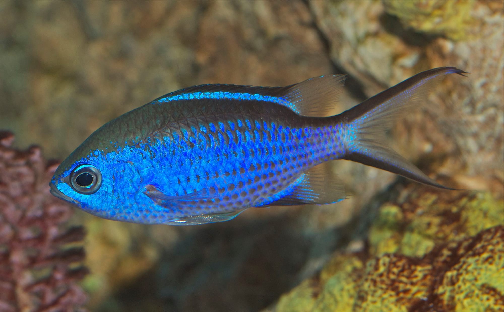 Blue chromis (top left), Beaugregory (top middle) a juvenile longfin damselfish (top right), blue hamlet (bottom left), rock beauty (bottom right) (All photo credits go to Florent's Guide To The Florida, Bahamas & Caribbean Reefs).