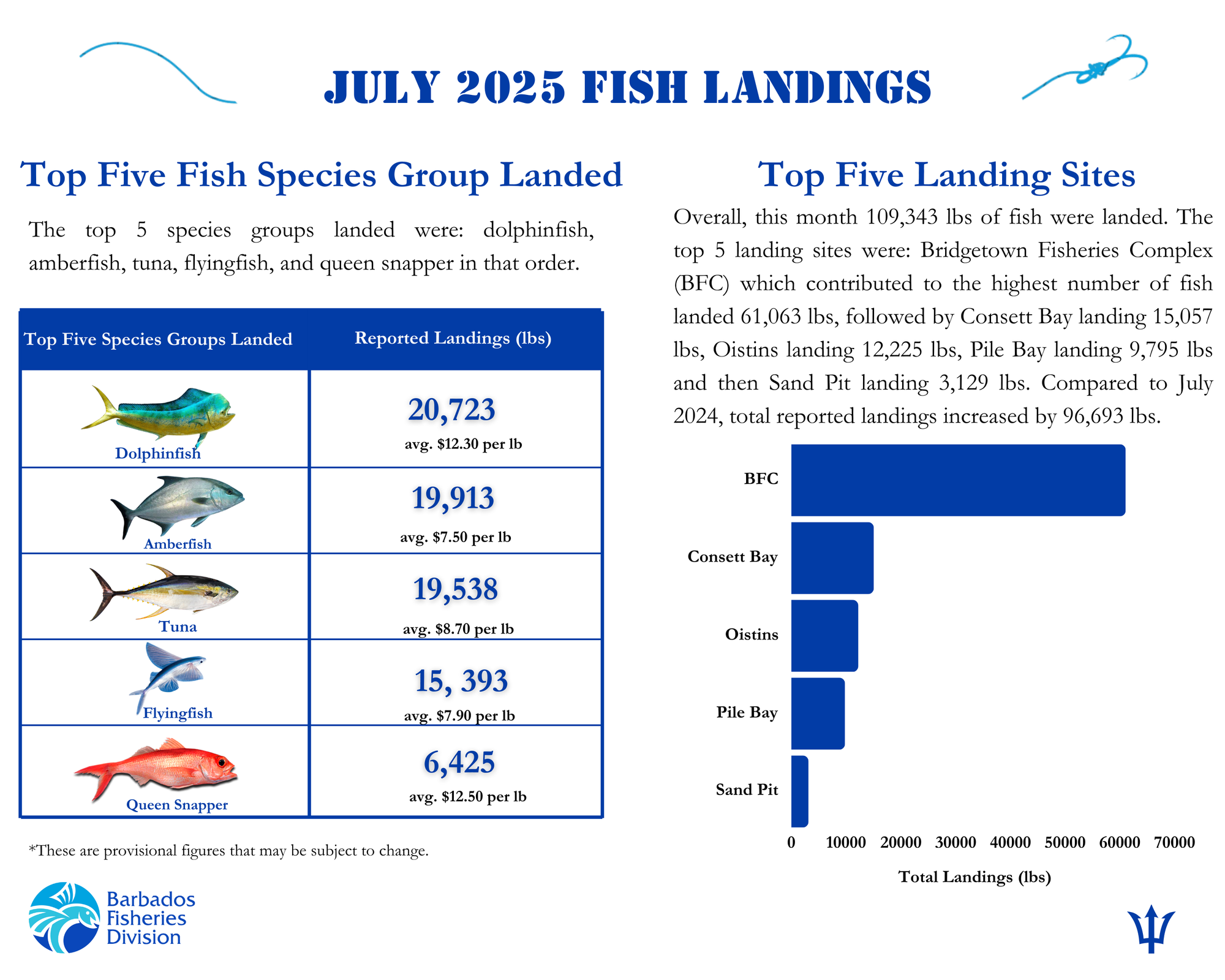 Overall, this month 109,343 lbs of fish were landed. The top 5 landing sites were: Bridgetown Fisheries Complex (BFC) which contributed to the highest number of fish landed 61,063 lbs, followed by Consett Bay landing 15,057 lbs, Oistins landing 12,225 lbs, Pile Bay landing 9,795 lbs and then Sand Pit landing 3,129 lbs. Compared to July 2024, total reported landings increased by 96,693 lbs.