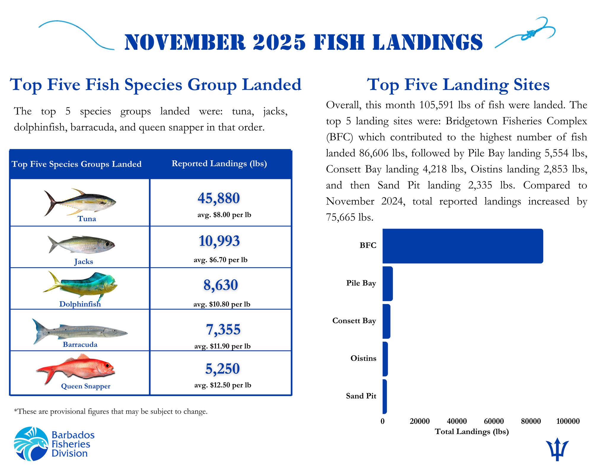 Overall, this month 105,591 lbs of fish were landed. The top 5 landing sites were: Bridgetown Fisheries Complex (BFC) which contributed to the highest number of fish landed 86,606 lbs, followed by Pile Bay landing 5,554 lbs, Consett Bay landing 4,218 lbs, Oistins landing 2,853 lbs, and then Sand Pit landing 2,335 lbs. Compared to November 2024, total reported landings increased by 75,665 lbs.