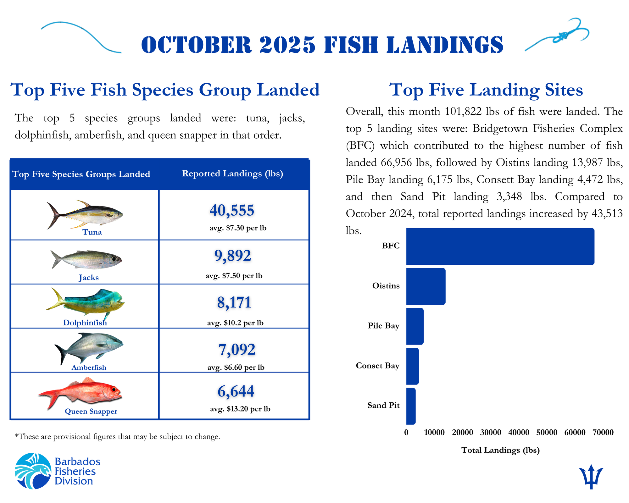 Overall, this month 101,822 lbs of fish were landed. The top 5 landing sites were: Bridgetown Fisheries Complex (BFC) which contributed to the highest number of fish landed 66,956 lbs, followed by Oistins landing 13,987 lbs, Pile Bay landing 6,175 lbs, Consett Bay landing 4,472 lbs, and then Sand Pit landing 3,348 lbs. Compared to October 2024, total reported landings increased by 43,513 lbs.