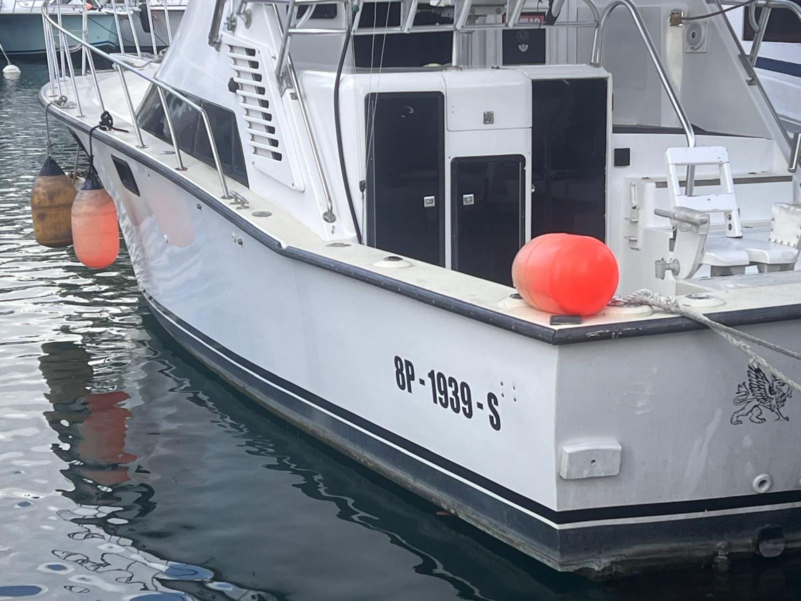 The placement of the numbers can be seen in the photo below. The pilot Sport fishing vessel ‘The Gryphon’ (8P-1939-S) is featured. The formal registration process for Sport fishing and recreational vessels is scheduled to begin in June 2026.