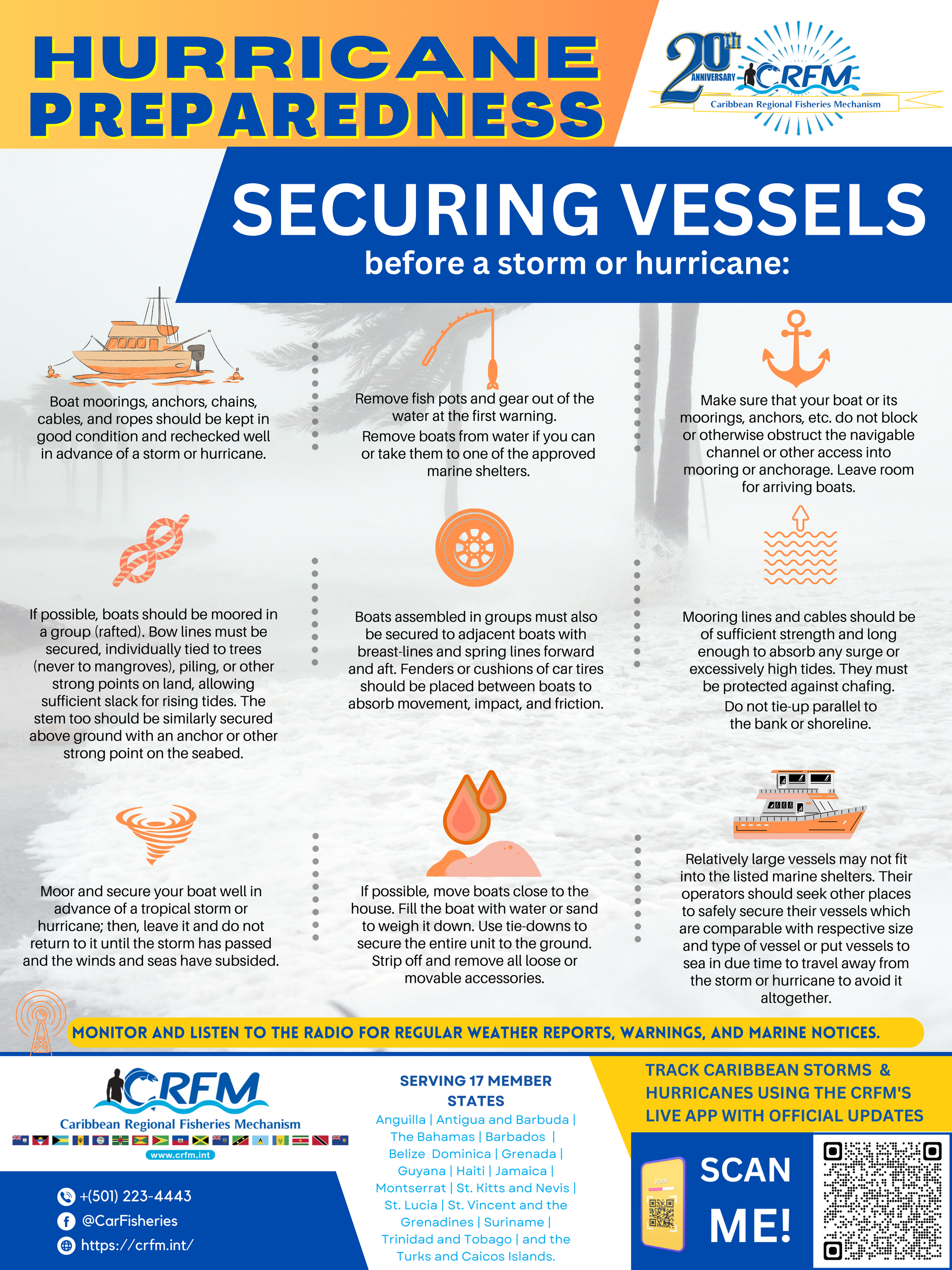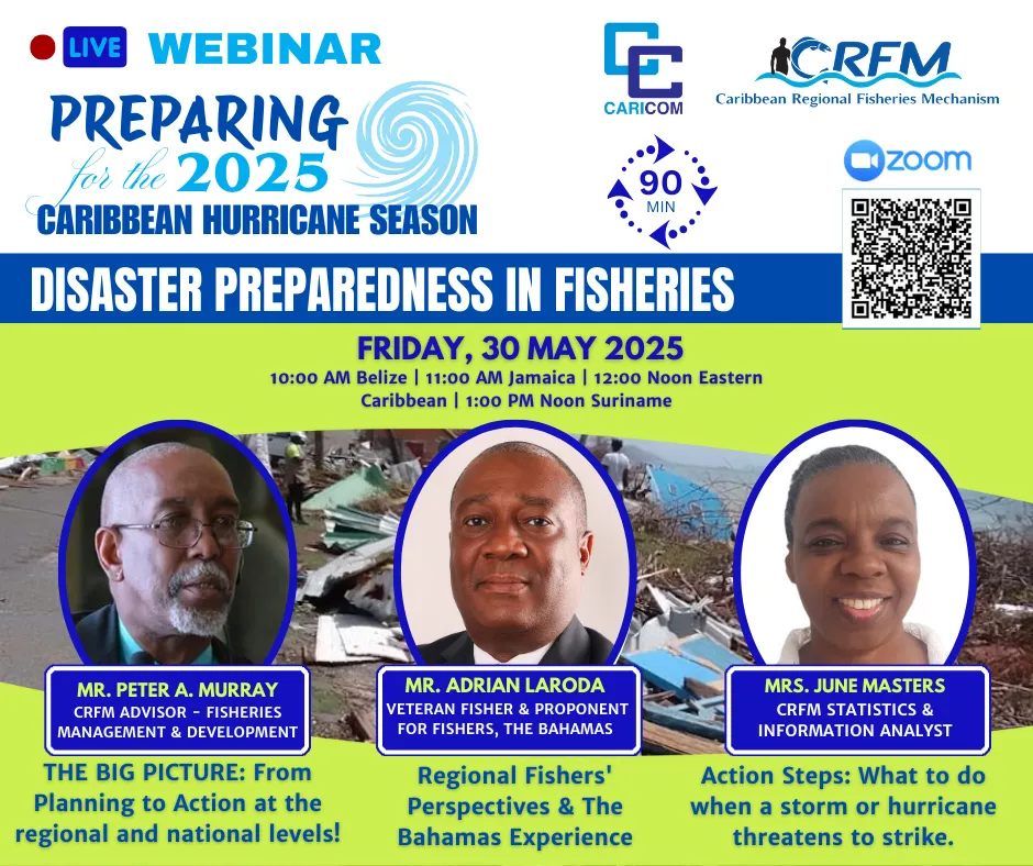 For more information on hurricane preparedness, the Caribbean Regional Fisheries Mechanism (CRFM) is hosting webinars targeted towards fisherfolk. Upcoming webinars include: